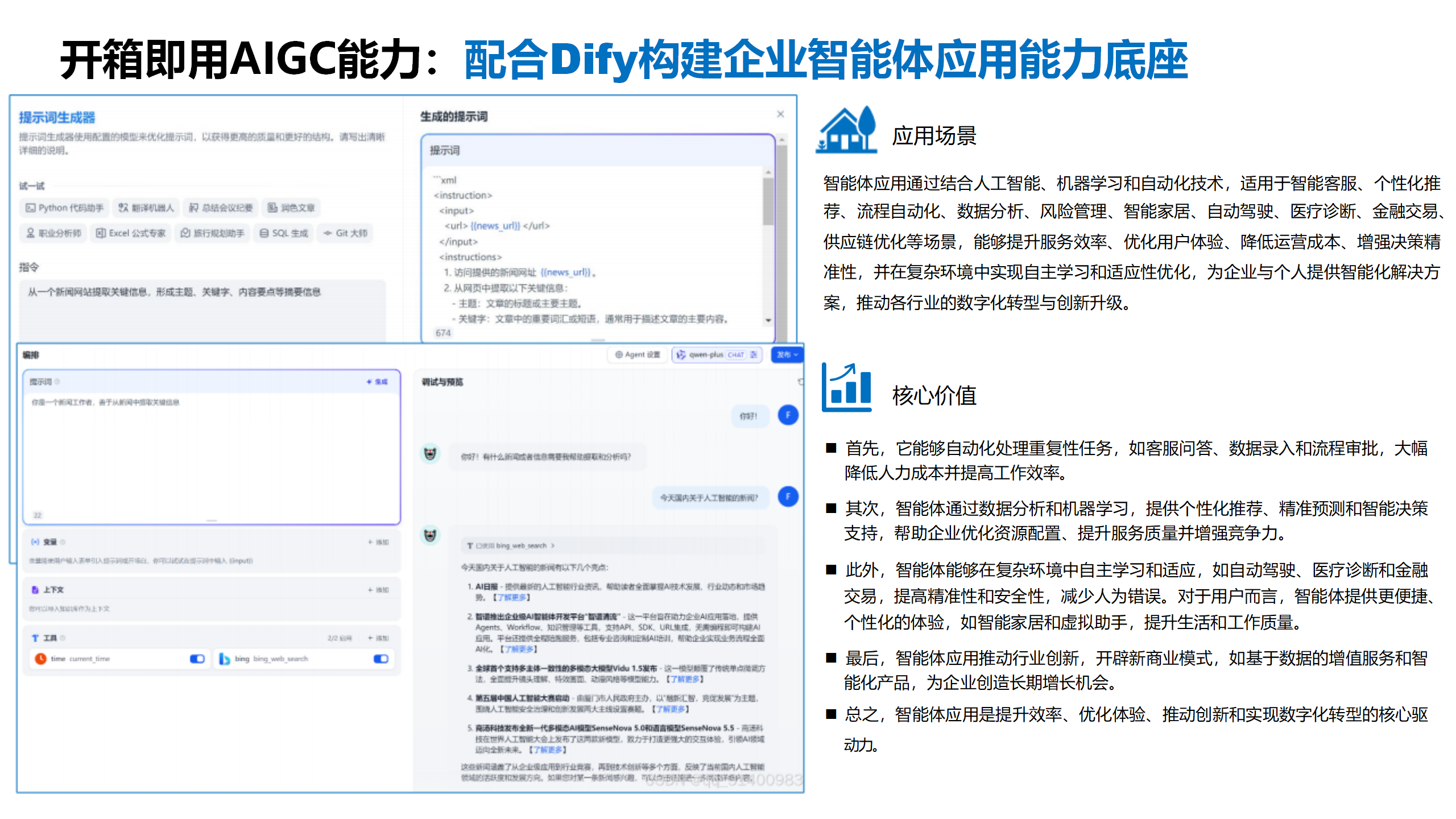 基于大模型的应用开发平台,提供RAG、Workflow、Agent等应用开发方式、MCP及原子能力(API)服务,助力企业加速大模型应用落地。